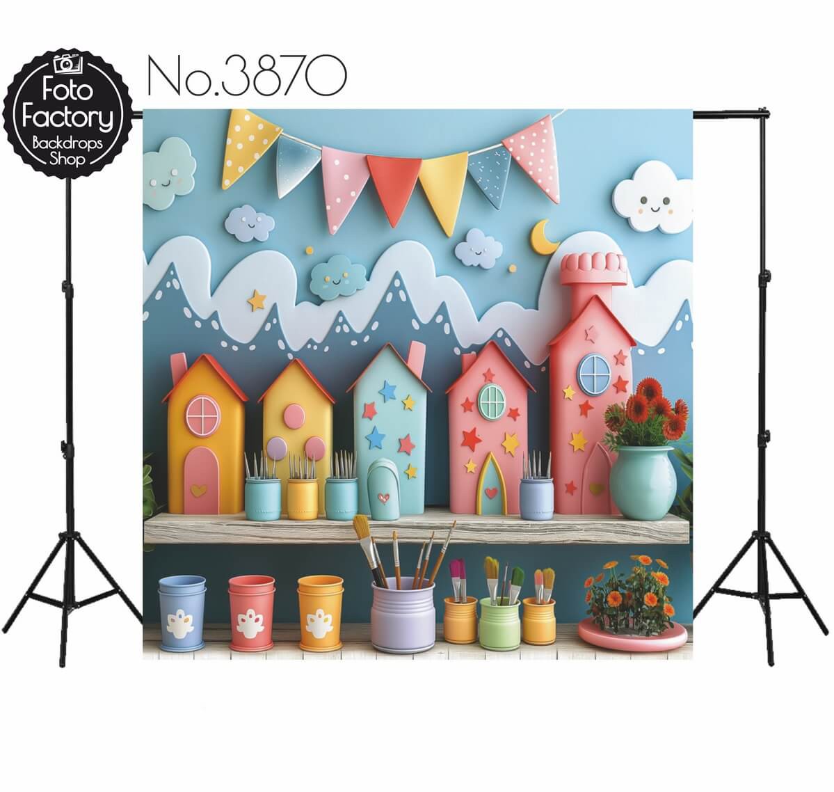 15 centimeters of white vinyl/fabric at the top of the backdrop. Designed for assembly with clips or chain systems.