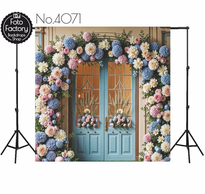 Tło Fotograficzne wiosenne wiosna kwiaty niebieskie drzwi 4071
