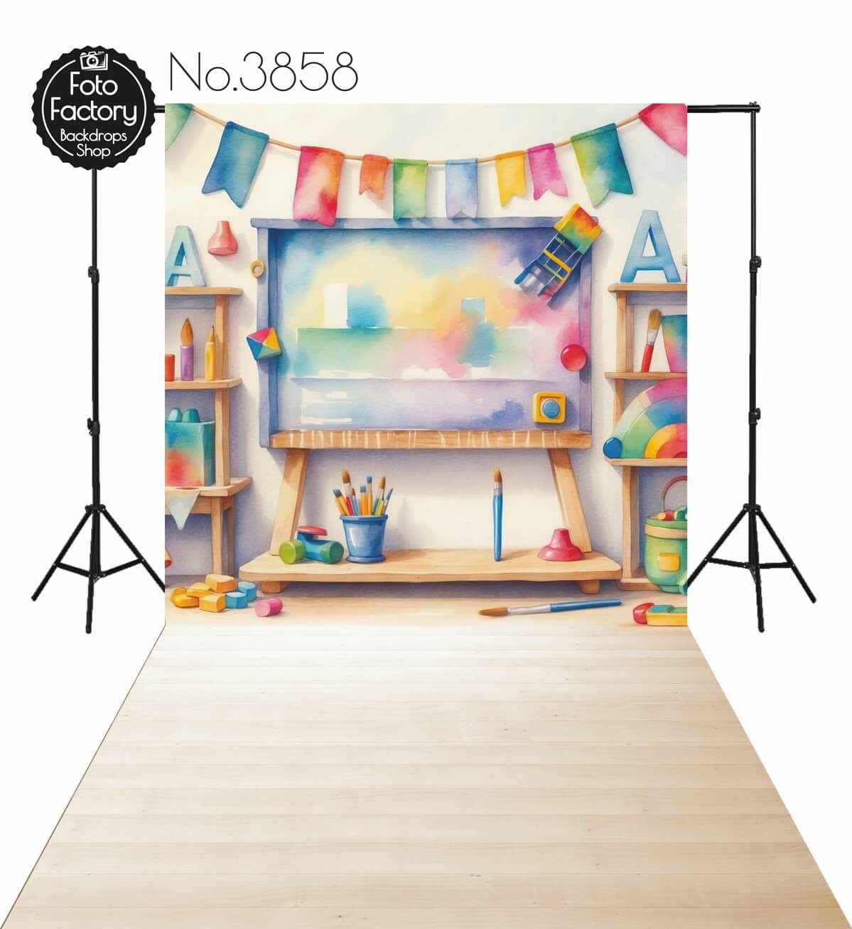 15 cm białego winylu/tkaniny na górze tła. Przystosowane do montażu za pomocą klipsów lub do systemów łańcuszkowych.